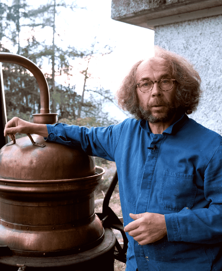Depuis plus de deux décennies, Matthieu Frécon explore un art ancestral et fascinant : celui de la distillation. Son parcours l'a conduit au cœur des Alpes valaisannes, où il a établi son laboratoire et sa distillerie. Plus qu'un simple distillateur, cet artisan est un véritable alchimiste et herboriste. Il puise dans la nature qui l'entoure une source inépuisable d'inspiration et de matières premières.